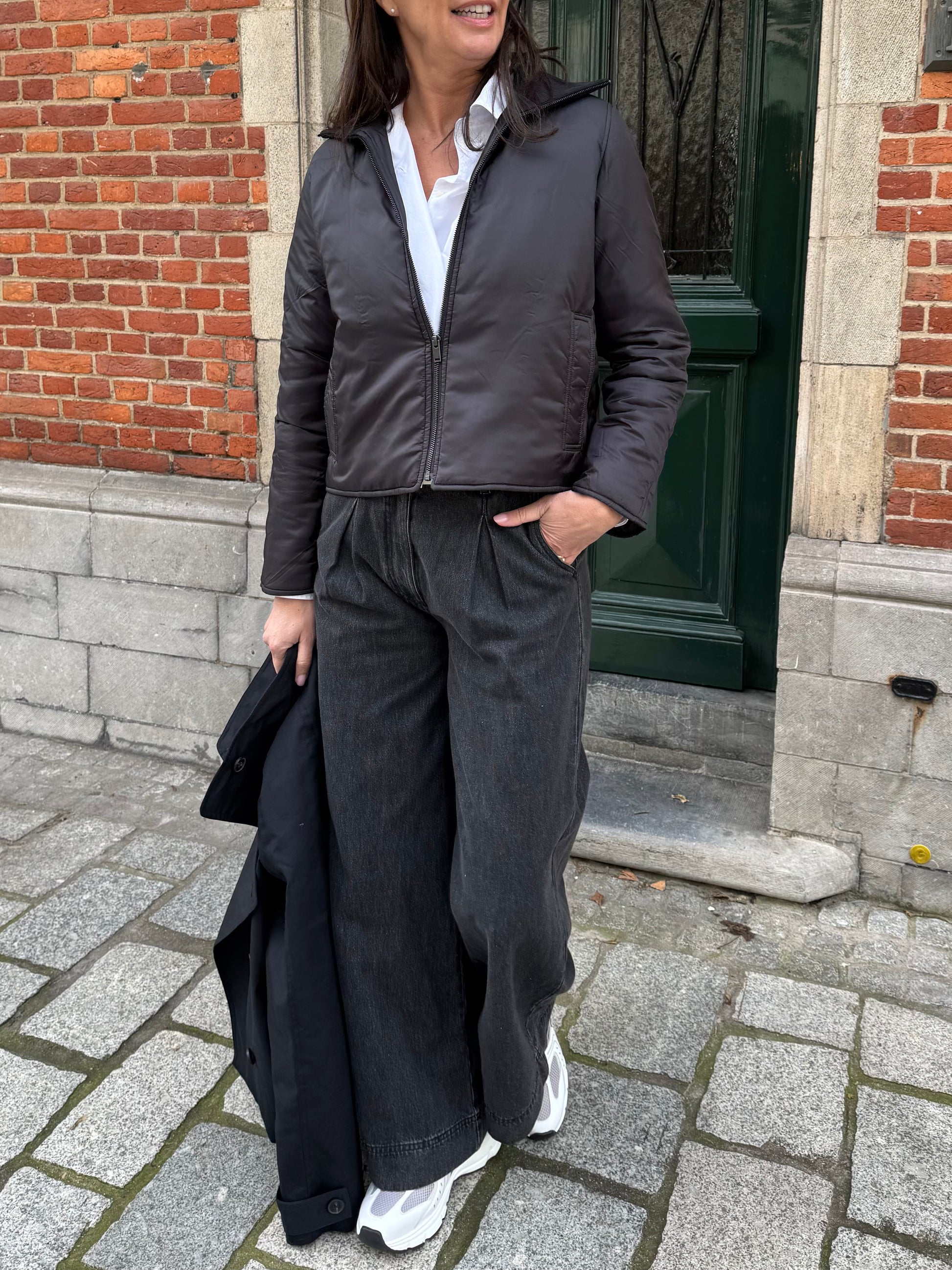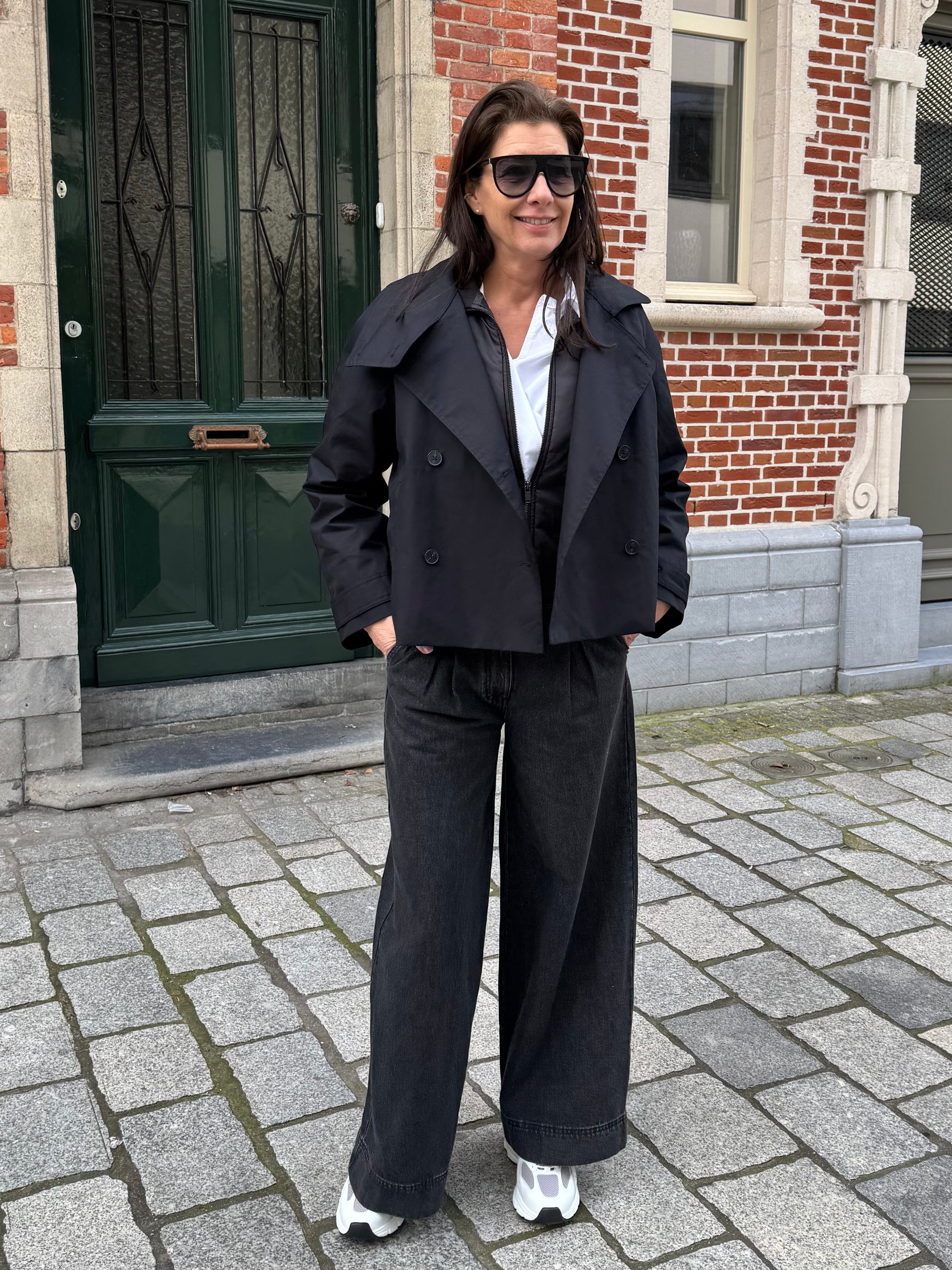 2-in-1 jas, bestaande uit een korte trenchcoat en een gewatteerde jas met een normale pasvorm en verlaagde schouders. Dubbelrijige knoopsluiting aan de voorkant van de buitenjas en ritssluiting aan de voorkant van de binnenjas. Verstelbare manchetten met knoopbandjes aan de buitenjas. Hoge kraag bij beide jassen. Paspelzakken aan de voorkant van beide jassen. Binnenjas is gewatteerd.